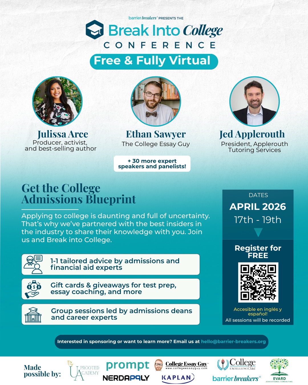Barrier Breakers, a national education nonprofit, is hosting our annual Break Into College Conference, a free, fully virtual event designed to help high school students and families navigate the college admissions process with clarity and confidence.